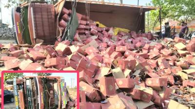 हाइवे 18 भदभदा पर शराब से भरा ट्रक पलटा, सड़क पर बिखरे कार्टून, क्वार्टर लेने उमड़ी भीड़, पुलिस ने संभाला मोर्चा