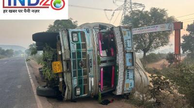 हाइवे 18 के दीवानगंज में भूसे से भरा ट्रक पलटा, बाल बाल बचे ड्राइवर क्लीनर