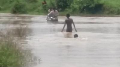 घोड़ापछाड़ नदी उफान पर, रास्ता बंद, जान जोखिम में डालकर नदी पार कर रहे ग्रामीण