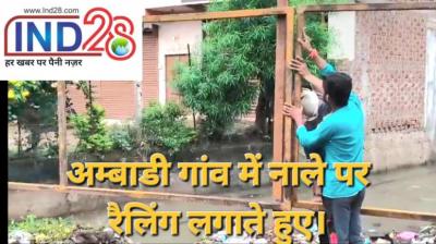 अंबाडी गांव में हादसों की रोकथाम के लिए नाले पर लगाई जा रही लोहे की रेलिंग