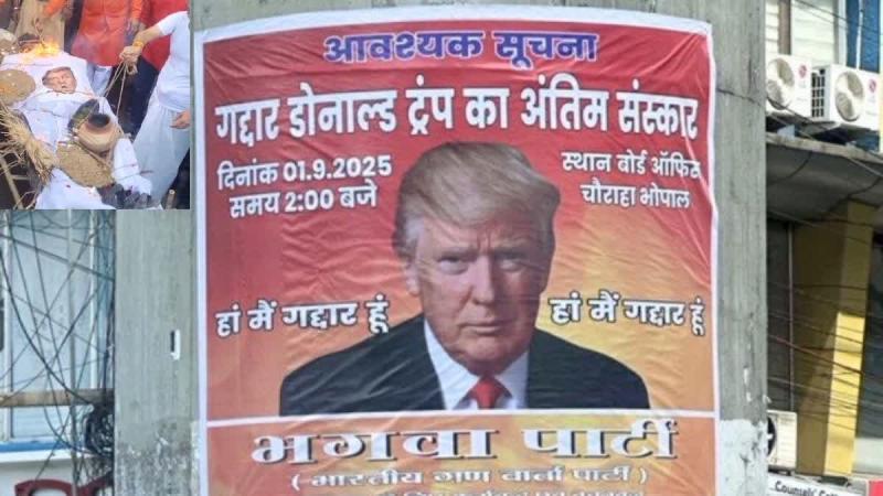 भारतीय गणवार्ता पार्टी ने भोपाल के बोर्ड ऑफिस चौराहे पर विरोध में अमेरिकी राष्ट्रपति डोनाल्ड ट्रंप का पुतला फूंका. इसके बाद उनकी शव यात्रा निकाली. पार्टी पदाधिकारियों का कहना है कि शवयात्रा के 13 दिन बाद ट्रंप की तेरहवीं भी की जाएगी. इसमें लोगों को मृत्युभोज कराया जाएगा. पार्टी के अध्यक्ष शिवकांत शुक्ला ने कहा कि "डोनाल्ड ट्रंप ने भारत के साथ दोस्ती के नाम पर गद्दारी की है. 50 फीसदी टैरिफ और ट्रंप द्वारा भारत के साथ धोखा दिया गया है.