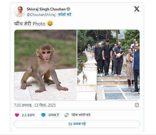 इसी दौरान बड़ा महादेव मंदिर परिसर में कुछ बंदर केंद्रीय कृषि मंत्री के सामने पहुंच गए. यहां रुक कर बंदरों की उछल कूद भी उन्होंने देखी. यहां ली गई एक छोटे बंदर की फोटो के साथ शिवराज सिंह ने सोशल मीडिया पर पोस्ट भी किया, जिसमें लिखा 'खींच मेरी फोटो.' बंदर की यह फोटो सोशल मीडिया पर खूब वायरल हो रही है. यूजर्स ने तरह-तरह की प्रतिक्रियाएं दी.