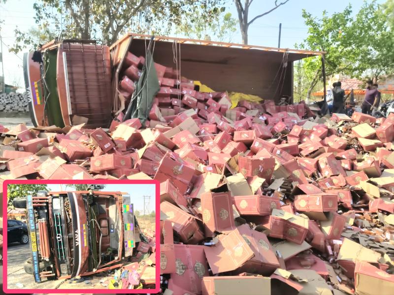 हाइवे 18 भदभदा पर शराब से भरा ट्रक पलटा, सड़क पर बिखरे कार्टून, क्वार्टर लेने उमड़ी भीड़, पुलिस ने संभाला मोर्चा