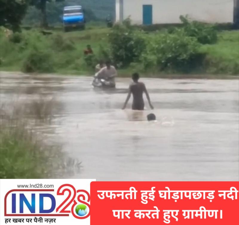 घोड़ापछाड़ नदी उफान पर, रास्ता बंद, जान जोखिम में डालकर नदी पार कर रहे ग्रामीण