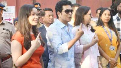 सचिन तेंदुलकर ने मुंबई में परिवार के साथ किया मतदान